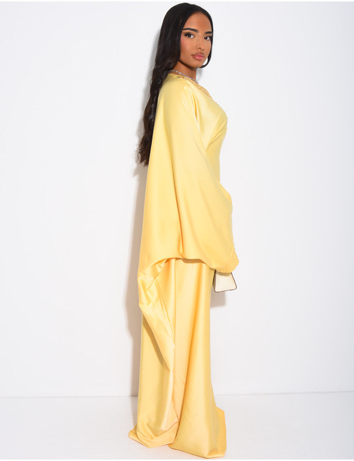 Premium-Abaya aus Satin mit handbestickten Perlen.